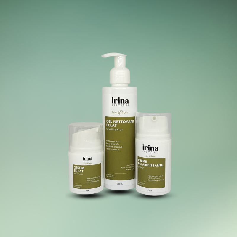 Le Pack Éclat Irina Cosmetics répond parfaitement à ces trois étapes, grâce à une combinaison de produits complémentaires : Gel Nettoyant Éclat, Sérum Éclat, et Crème Éclaircissante.